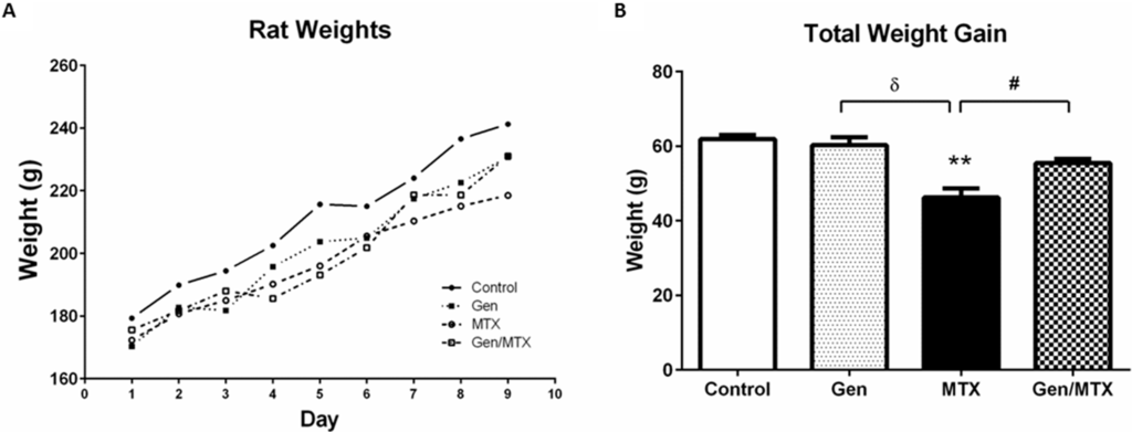 Effects of methotrexate (MTX) with/or without genistein on body weight gain. (A) Representative graph of weight accumulation over the period of treatment illustrating that MTX treatment (open circles, dashed line) slowed body weight gain, whilst the MTX and genistein combination (Gen/MTX, open square, dashed line) recovered their weight by the end of the trial; (B) Total body weight gained over the period of MTX administration until specimen collection. MTX significantly reduced weight accrual when compared to control group (** p < 0.01) or to the Gen alone group (δ p < 0.001), and Gen supplementation (Gen/MTX) significantly attenuated the weight accrual suppression when compared to MTX alone group (# p < 0.05) (n = 6).