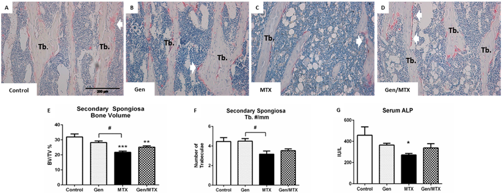 As an assessment of the treatment impact on bone formation, the serum concentrations of bone formation marker alkaline phosphatase (ALP) were measured and were shown to be significantly reduced following MTX treatment when compared to the control (Figure 2G). However, there were no differences between other groups, and genistein in combination with MTX did not rescue this MTX effect.