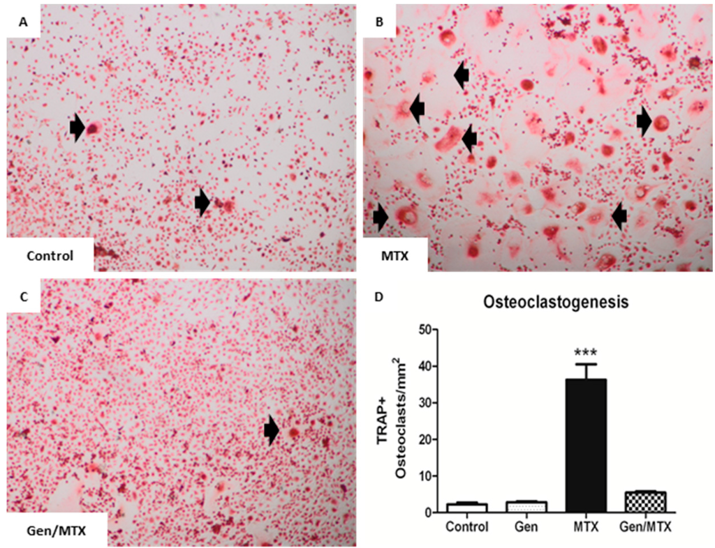 Genistein is known to reduce bone resorption in vivo [39] and also suppress osteoclast formation in vitro [37,40]. Here, the effect of genistein treatment in vivo upon the potential of the bone marrow cells of treated rats to form mature osteoclasts ex vivo was examined in macrophage colony stimulating factor (M-CSF) and RANKL-induced osteoclastogenesis cultures (Figure 4). Osteoclasts (black arrows), identified via light microscopy as large TRAP+ multinucleated (≥3 nuclei) cells, were apparent in cultures from all treatment groups (Figure 4A–C) but were present in significantly greater numbers in cultures of MTX alone-treated rats (p < 0.001) (Figure 4A vs. Figure 4B,D). Noticeably, the co-treatment of MTX with genistein significantly suppressed the effect of MTX-induced osteoclastogenesis (5.5 ± 0.4 vs. 36.3 ± 4.2 osteoclasts/mm2, respectively, p < 0.001 between the MTX plus genistein group and the MTX alone group) (Figure 4C,D).