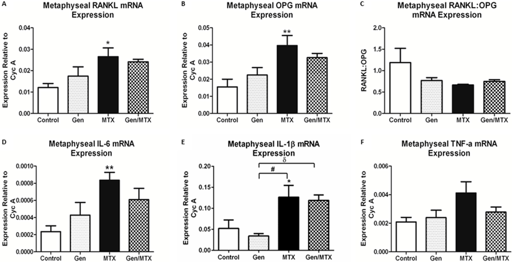 MTX administration increased mRNA expression of receptor activator of NF-κB ligand (RANKL), osteoprotogerin (OPG), interleukin-6 (IL-6), and IL-1β in the metaphysis bone compared to control rats. (A,B) Quantitative RT-PCR of osteoclastogenesis regulators RANKL and OPG, respectively, within the metaphysis; (C) Ratio of relative mRNA expression of RANKL to OPG; (D–F) Quantitative RT-PCR of pro-inflammatory cytokines IL-6, IL-1β, and tumor necrosis factor-alpha (TNF-α), respectively. n = 6, * p < 0.05 and ** p < 0.01 vs. control; # p < 0.01 between Gen and MTX alone groups, and δ p < 0.05 between Gen alone and Gen/MTX groups.