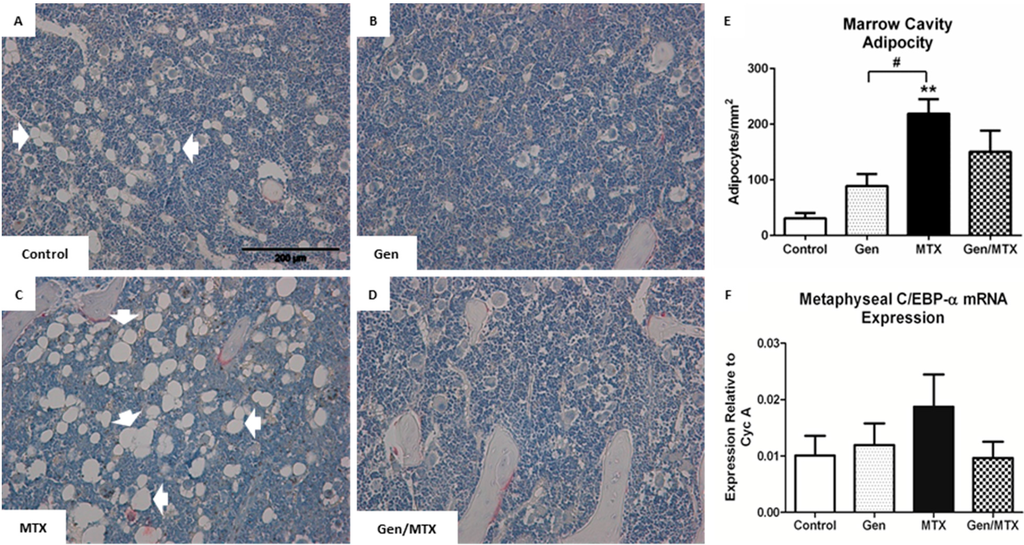 Adipocytes, which are found interspersed within marrow cells in the lower metaphysis and diaphysis of long bones, have been shown to be sensitive to MTX chemotherapy and thus were examined here (Figure 6). MTX significantly increased the density of adipocytes within the marrow cavity of the lower metaphysis when compared to the control (p < 0.01) and genistein alone (p < 0.05) groups (Figure 6A,B vs. Figure 6C,E). Whilst the bones of rats with the combination treatment of genistein with MTX (Gen/MTX) displayed fewer adipocytes, this was not significantly lower than those arising from MTX alone (Figure 6C vs. Figure 6D,E). Since an increase in the expression of adipogenic transcription factor CCAAT/enhanced binding protein-α (C/EBPα) mRNA expression is associated with initiation of adipocyte formation, its relative expression level within the metaphysis was also examined to see if genistein affected adipogenesis following MTX treatment. MTX alone-treated animals tended to exhibit a higher expression level compared to saline controls (control vs. MTX, p = 0.9064), whilst the Gen/MTX combination treatment tended to attenuate MTX-induced C/EBP-α expression (MTX vs. Gen/MTX, p = 0.9275) (Figure 6F).