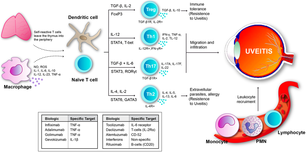 Uveitis results from imbalance between inflammatory mechanisms and regulatory mechanisms. Acute inflammation initiated by those cells that are previously present in affected tissues, mainly resident macrophages and dendritic cells []. In autoimmune uveitis, self-reactive T cells leave the thymus and when they reach the eye they come in contact with retinal antigens. Myeloid dendritic cells present a solid ability of capturing antigens, which enables them to stimulate T cells. Therefore, T-lymphocytes may differentiate into Tregs, Th1, Th17 or Th2 for precise immune response in function of the antigen encountered and cytokine presence. Th1 and Th17 cells participate in inflammatory and autoimmune uveitis. Th1 cells are crucial for the development of uveitis, whereas Th17 cells play a relevant role in the late/chronic phase of uveitis, however induced Treg cells defeat both Th1 and Th17 cell responses [,,,,]. Furthermore, the migration of Th1 and Th 17 to the eye, also results in the breaking down of the blood-retinal barrier and, consequently, different leukocytes from the circulation are recruited. In the figure, we can also see the main biologics that are being presently used in uveitis therapy and its targets.