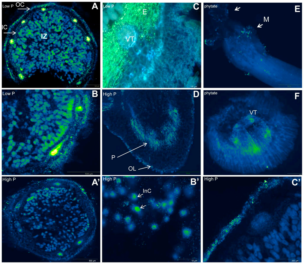 - Tang, H.; Li, X.; Zu, C.; Zhang, F.; Shen, J. Spatial distribution and expression of intracellular and extracellular acid phosphatases of cluster roots at different developmental stages in white lupine. J. Plant Physiol. 2013, 170, 1243–1250. [Google Scholar] [CrossRef] [PubMed]