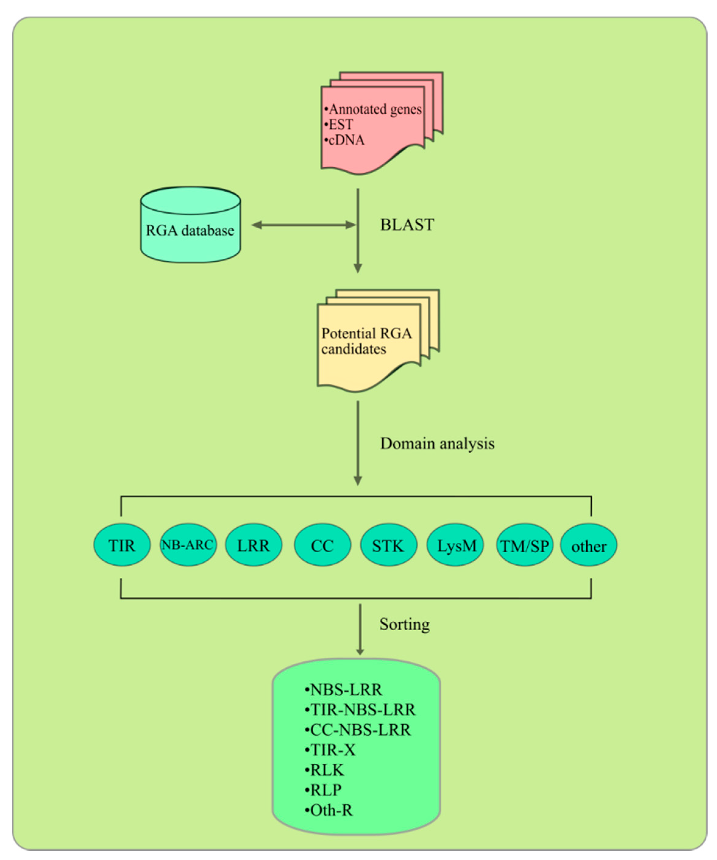 - Sanseverino, W.; Roma, G.; de Simone, M.; Faino, L.; Melito, S.; Stupka, E.; Frusciante, L.; Ercolano, M.R. PRGdb: A bioinformatics platform for plant resistance gene analysis. Nucleic Acids Res. 2010, 38, D814–D821. [Google Scholar] [CrossRef] [PubMed]