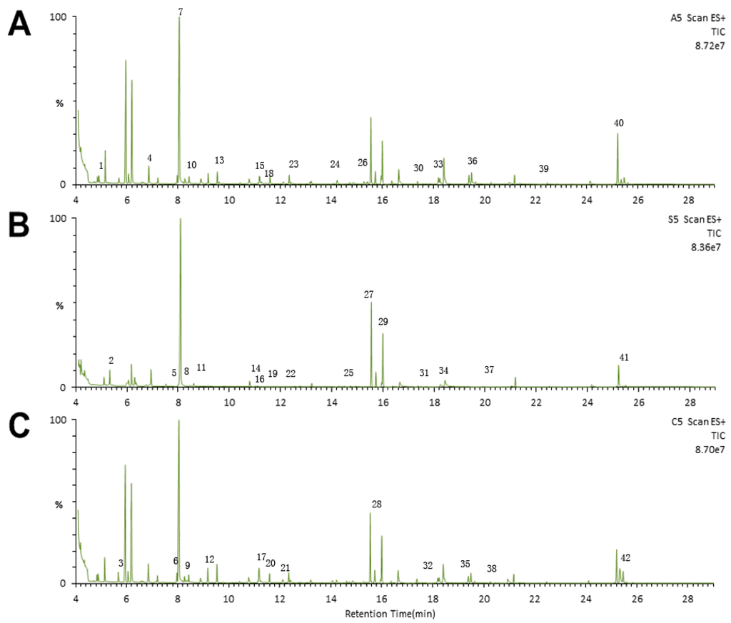 Representative gas chromatography–mass spectrometry (GC–MS) total ion chromatograms. Chromatograms from the (A) Hu-H1 group; (B) Strain V group; and (C) non-infected control (CON) group. (1) Pyruvic acid; (2) Glycolic acid; (3) l-Alanine; (4) l-Valine; (5) Ethanolamine; (6) l-Leucine; (7) Glycerol; (8) l-Isoleucine; (9) l-Proline; (10) Glycine; (11) Methylsuccinic acid; (12) Serine; (13) l-Threonine; (14) Malic acid; (15) l-Methionine; (16) Pyroglutamic acid; (17) l-Aspartic acid; (18) γ-Aminobutyric acid; (19) Creatinine; (20) l-Cysteine; (21) 3-Hydroxy-3-methylglutaric acid; (22) l-Glutamic acid; (23) Phenylalanine; (24) Glycerol-3-phosphate; (25) Citric acid; (26) d-Fructose; (27) d-Glucose; (28) l-Lysine; (29) Sorbitol; (30) Myo-Inositol; (31) Margaric acid; (32) Ribulose-5-phosphate; (33) Oleic acid; (34) Octadecanoic acid; (35) d-Fructose-6-phosphate; (36) d-Glucose-6-phosphate; (37) Eicosanoic acid; (38) Myo-Inositol-1-phosphate; (39) d-Lactose; (40) Cholesterol; (41) Lanosterol; (42) Desmosterol.