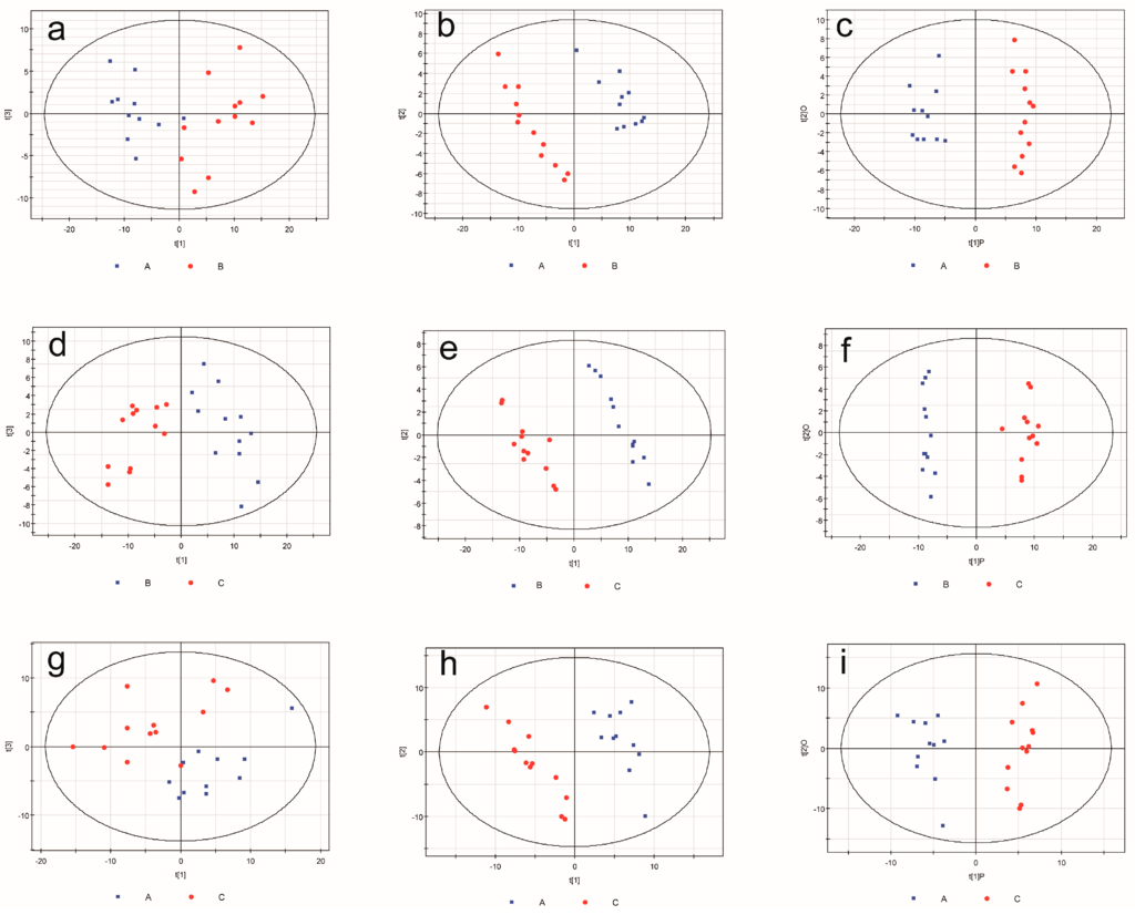 Multivariate statistical analysis. Principal component analysis (PCA) scores plot derived from GC–MS spectra of rat cortical neurons infected from (a) Hu-H1 and Strain V; (d) Strain V and non-infected control (CON); and (g) Hu-H1 and CON. Paired partial least-squares discriminant analysis (PLS-DA) model showing a clear separation between rat cortical neurons infected from (b) Hu-H1 and Strain V; (e) Strain V and CON; and (h) Hu-H1 and CON. Orthogonal partial least-squares discriminant analysis (OPLS-DA) model showing clear separation between rat cortical neurons infected with (c) Hu-H1 and Strain V; (f) Strain V and CON; and (i) Hu-H1 and CON. (A represents Hu-H1; B represents Strain V; C represents non-infected control (CON).)