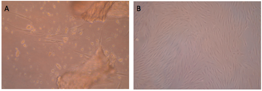 Morphology and cell-surface antigens of subchondral cortico-spongious progenitor cells (SPCs) in late-stage osteoarthritis (OA) patients. (A) Cells outgrew from subchondral bone chips and attached after 4‒6 days of culture (×400); (B) Cells (P1) at 90% confluence after 14 days of culture were spindle-shaped and fibroblast-like (×100).
