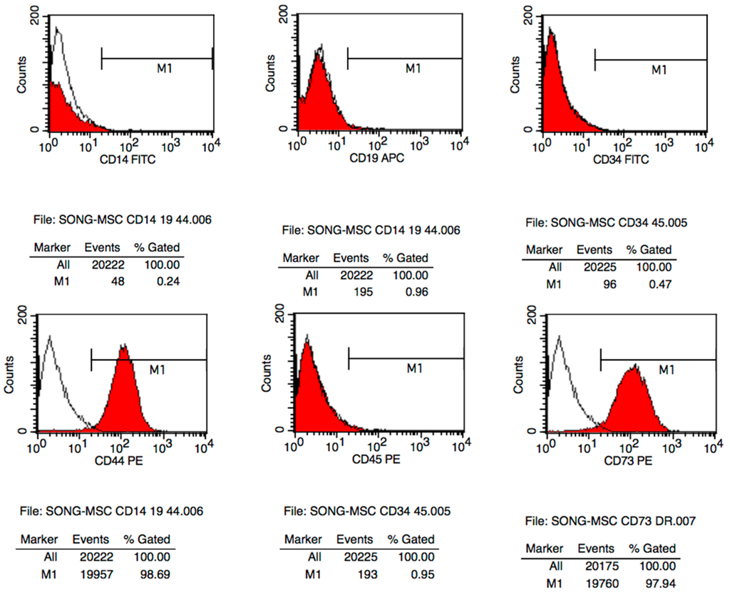 Cells (250,000 cells, passage 3) was harvested and washed by PBS/0.5% bovine serum albumin (BSA) twice, then incubated with phycoerythrine (PE), fluorescein isothiocyanate (FITC) or allophycocaine (APC)-labeled monoclonal mouse anti-human antibodies CD14 FITC, CD19 APC, CD34 FITC, CD44 PE, CD45 PE, CD73 PE, CD90 APC, CD105 FITC, CD146 PE, CD166 PE, HLA-DR APC (all Abcam, Cambridge, UK) for 15 min on ice. Staining of cell surface antigens was analyzed using FACS Calibur (Becton and Dickinson). Apoptotic cells were excluded from analysis using propidium iodide (PI). Unstained cells served as negative, and CD 34-PE/FITC-stained cells served as isotypic control.