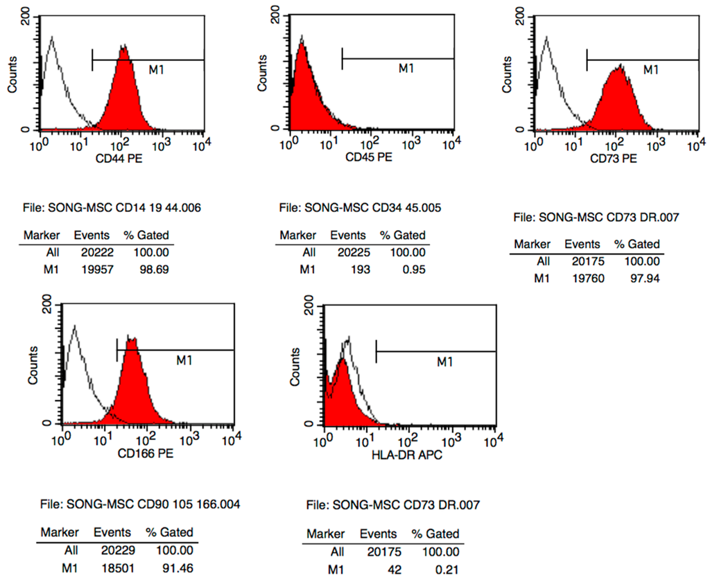 Cell-surface antigens of SPCs in late-stage OA patients. Cells were positive for CD44 (98.69%), CD73 (97.94%), CD90 (99.88%), CD166 (91.46%), partly positive for CD105 (6.13%) and CD146 (10.41%), and negative for CD14 (0.24%), CD19 (0.96%), CD34 (0.47%), CD45 (0.95%) and HLD-DR (0.21%).