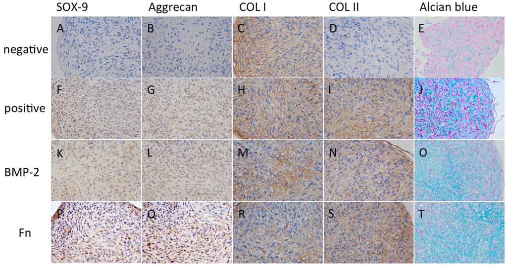 To assess effects of Fn stimulation on chondrogenic differentiation, COL II, aggrecan, SOX-9 and COL I were also detected by immunohistochemical staining, together with proteoglycans staining by alcian blue in each group at day 28. In general, SPCs stimulated by either BMP-2 or Fn formed matrix rich in COL II and proteoglycan, and pellet which seemed more dense in Fn group. SPCs showed a decreased level of COL I (Figure 4M,R), and increased levels of COL II (Figure 4N,S), aggrecan (Figure 4L,Q) and Sox-9 (Figure 4K,P) in Fn and BMP-2 groups. SPCs stimulated by either BMP-2 or Fn showed a significantly increased staining of proteoglycans (Figure 4O,T).