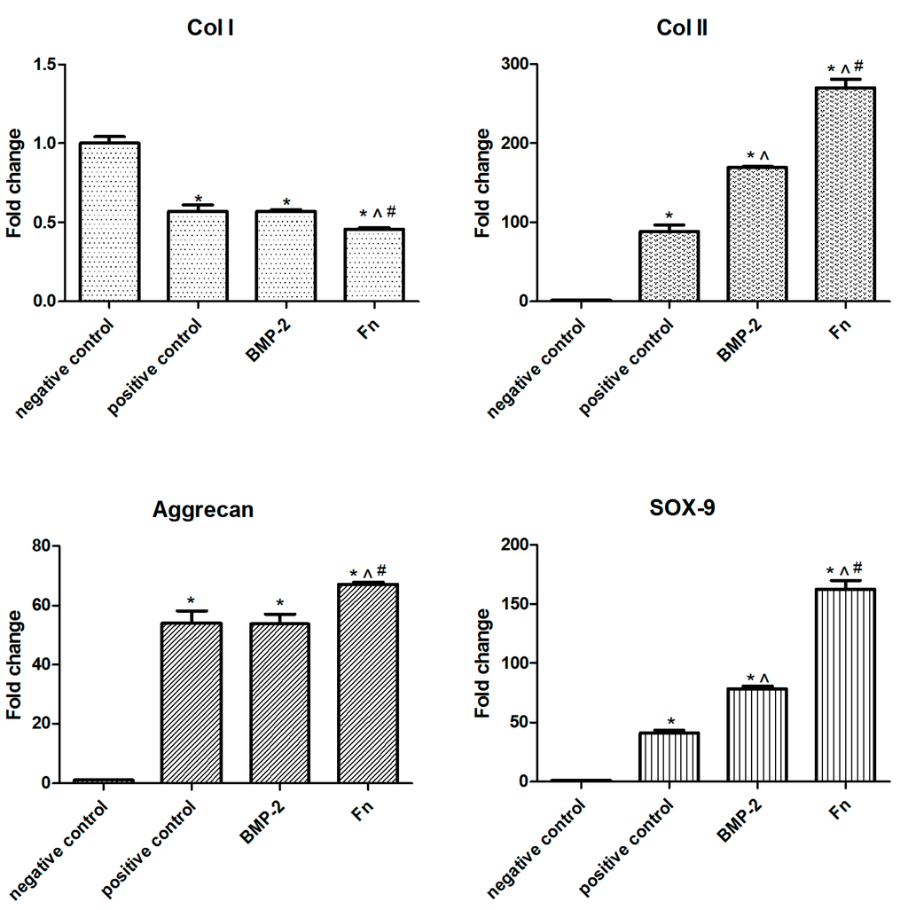 Genes related to chondrogenic differentiation were analyzed by RT-PCR at day 28. As for the fibrous tissue marker COL I, the mean expression level was 0.57 (positive control), 0.57 (BMP-2), and 0.46 (Fn), respectively (expression level in negative control group was designed as 1). As for the cartilage key marker gene COL II, the expression level was 88.11 (positive control), 168.97 (BMP-2), and 270.11 (Fn), respectively. The expression level of chondrogenic marker gene aggrecan was 54.04 (positive control), 53.76 (BMP-2), and 67.18 (Fn), respectively. The expression level of transcription factor Sox-9 was 41.29 (positive control), 78.09 (BMP-2), and 162.50 (Fn), respectively. Compared with negative group, all gene expression levels showed significant differences (p < 0.01). There were also significant differences between each stimulated groups (Figure 5). Treatment with BMP-2 or Fn stimulated chondrogenic differentiation of SPCs and the effect of Fn was stronger.
