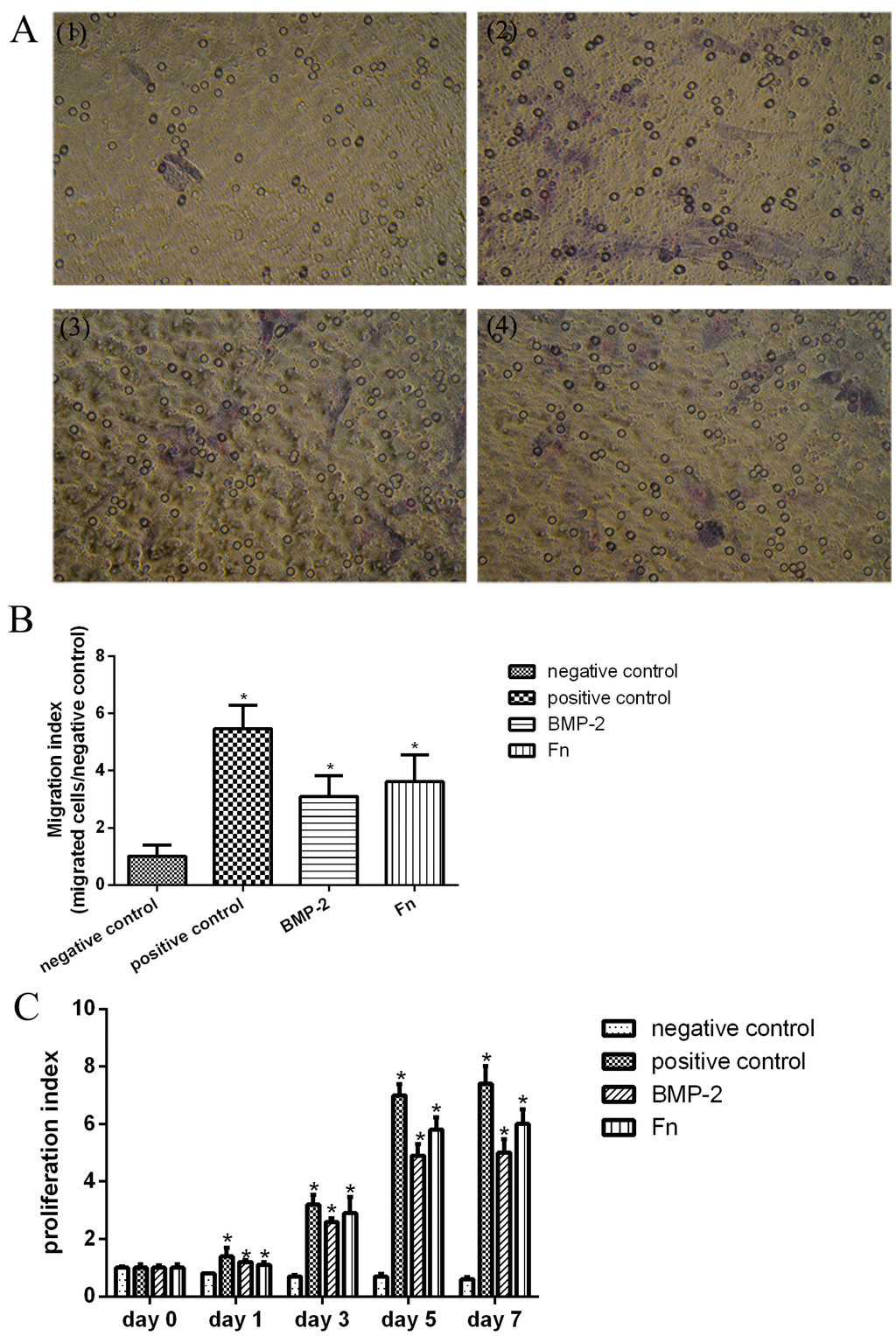 Quantification of proliferation and migration of SPCs cultured under different conditions. (A) SPCs migrated through the pores of the membrane and adhered at the bottom site of the polycarbonate membrane. Fenestra was the pore of the polycarbonate membrane, and SPCs were stained in purple and were spindle-shaped (×200). (1) Negative control; (2) positive control; (3) BMP-2 group; (4) Fn group; (B) The migration index in different groups. * Compared with negative control, p < 0.05; (C) Cell proliferation under different conditions. * Compared with day 0, p < 0.05. The mean of each triplicate well is plotted and the error bars represent SD.