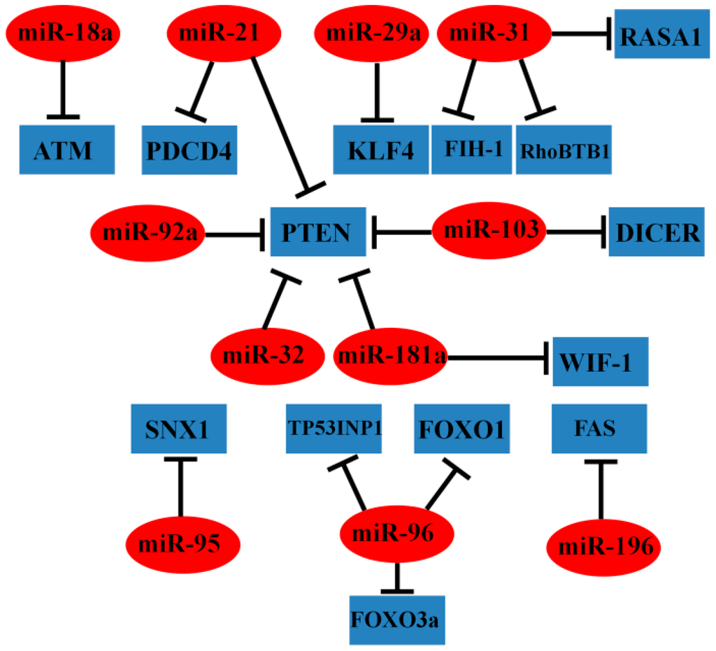 | miR-32 | ↑ | PTEN | cell proliferation, migration, invasion, apoptosis | [33] |