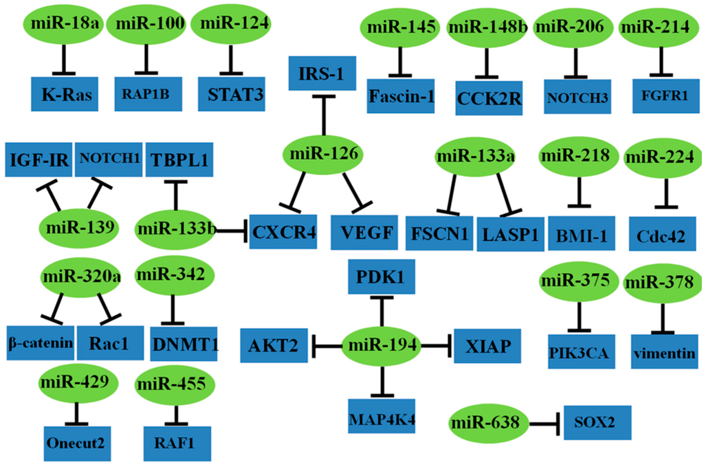 | miR-126 | ↓ | IRS-1, VEGF, CXCR4 | cells proliferation, migration, invasion, cell cycle arrest, angiogenesis, diagnosis | [50,51,52,53] |