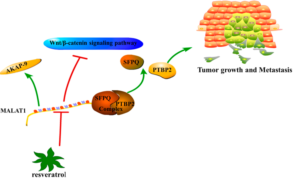 - Ji, Q.; Liu, X.; Fu, X.; Zhang, L.; Sui, H.; Zhou, L.; Sun, J.; Cai, J.; Qin, J.; Ren, J.; et al. Resveratrol inhibits invasion and metastasis of colorectal cancer cells via MALAT1 mediated Wnt/β-catenin signal pathway. PLoS ONE 2013, 8, e78700. [Google Scholar] [CrossRef] [PubMed]