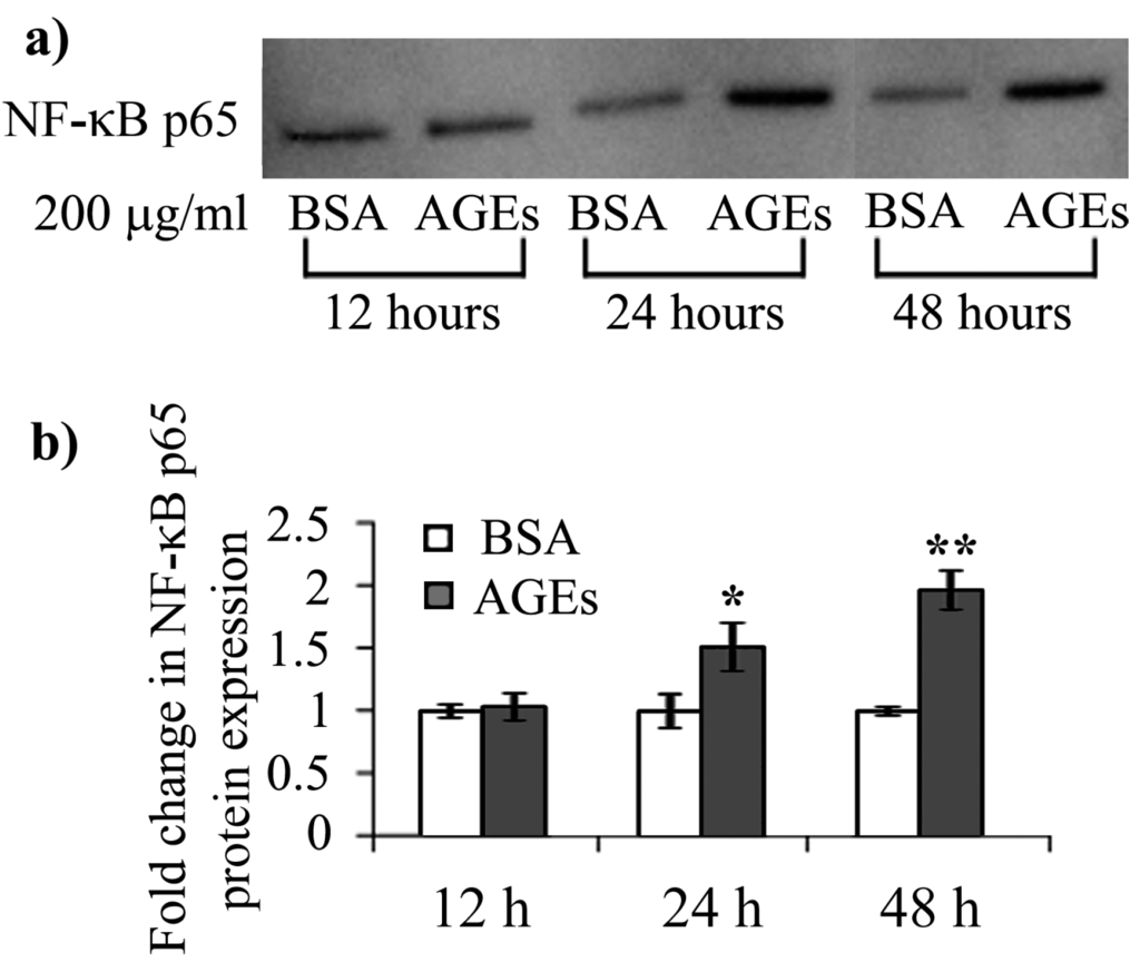 NF-κB p65 protein expression levels (a) Representative immunoblot membrane; (b) Combined densitometry data of three individual experiments, indicating fold changes in the protein expression of NF-κB p65, normalized to the total proteins transferred onto the membrane. BSA: bovine serum albumin; AGEs: advanced glycation end products; * p < 0.05; ** p < 0.01.