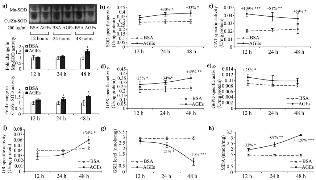 Antioxidative defence in HEK 293 cells and oxidative stress induced by AGEs exposure. (a) Representative zymogram indicating the activity of SOD enzymes and combined densitometry data of three zymograms indicating fold changes in Mn–SOD and Cu/Zn–SOD activities. The specific activities of total (b) SOD; (c) CAT; (d) GPX; (e) G6PD; (f) glutathione reductase (GR) antioxidative enzymes; (g) GSH and (h) advanced lipid oxidation end products (MDA, malondialdehyde). In (b–h), when statistically significant, the percent change values were given. * p < 0.05; ** p < 0.01; *** p < 0.001.