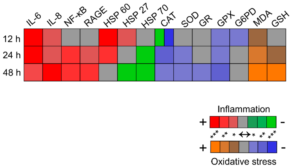 Heat plot indicating the parameters changes and their pro-/anti-inflammatory or the pro-/anti-oxidative contributions, as discussed in the text. The amplitude of the changes is color-coded based on the p value of statistic significance. The relative changes in the extracellular level of cytokines, protein expression levels of NF-κB, RAGE and HSPs and specific enzymatic activity are shown. * p < 0.05; ** p < 0.01; and *** p < 0.001.