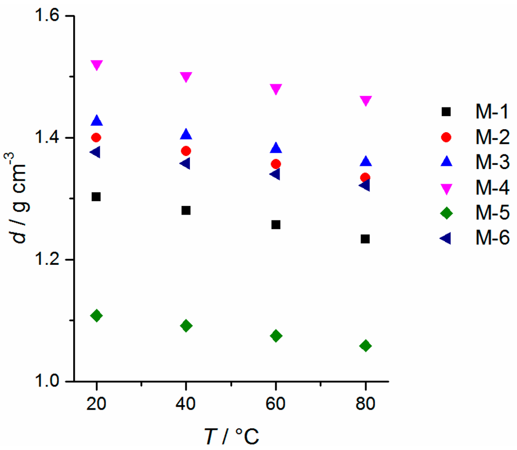 Temperature-dependent values of the density of mixtures M-n (n = 1–6).