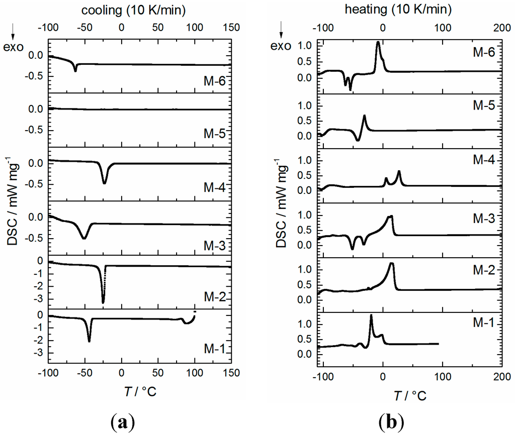 DSC measurements of mixtures M-n (n = 1–6) in closed cup during cooling (a) and heating (b) at 10 K·min−1 (exo down).