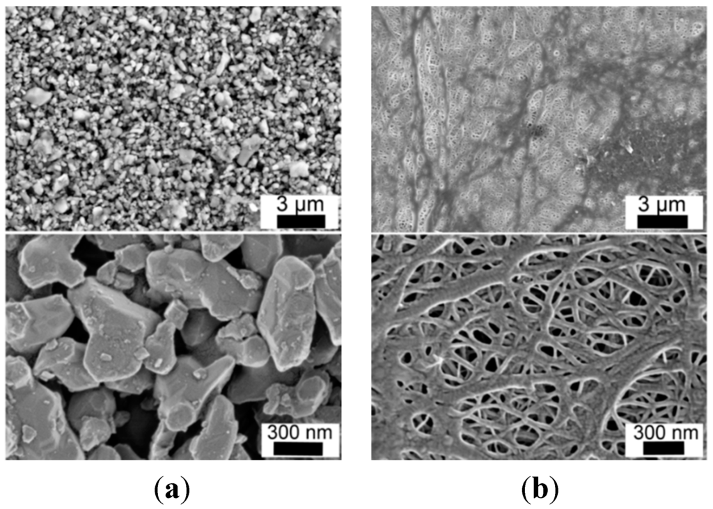 For this study, a polyethylene (PE) separator (COD-20) and a particle-coated PE separator (COATED) are used in comparison. Main characteristics are summarized in Table 3. The specific surface of both separators was measured (Table 3), where it differs by a factor of ~2 based on the additional weight of the ceramic layer. Both commercial separators are analyzed via scanning electron microscope (SEM) to visualize their surface structure (Figure 5). The cross section of the separator COATED is depicted in Figure 6. Both separators are composed of a polyethylene based porous membrane with its typical porous structure (Figure 5a). Based on the SEM images, the pore sizes can be estimated to be ~100–200 nm, which is much larger (~factor 100–500) than any hydrodynamic diameter of cationic Li+ species or anionic salts that are discussed in literature [38,39,40]. The separator COATED is covered by irregular shaped particles (size ≤ 2 µm) on its surface (Figure 5b), which are mainly identified as Al2O3 particles in energy dispersive X-ray spectroscopy (EDS) analysis. Traces of the elements Na and C were also observed, among others, on the surface of separator COATED, which can be explained by impurities and organic binder compounds. In the cross section image (separator COATED, Figure 6), it is seen that the surface of the porous PE membrane is completely covered by a porous particle coating with a thickness of 2–3 µm on each side. The permeability of air is almost identical for both separators, which reveals that the coating does not affect the gas permeability. It should be mentioned that PE melts at ~137 °C (provided as shut-down temperature), which influences the separator characteristics severely. The temperatures, which are applied during drying procedures, are therefore carefully controlled and not exceeded above 80 °C to ensure not to destroy the porosity fine structure.