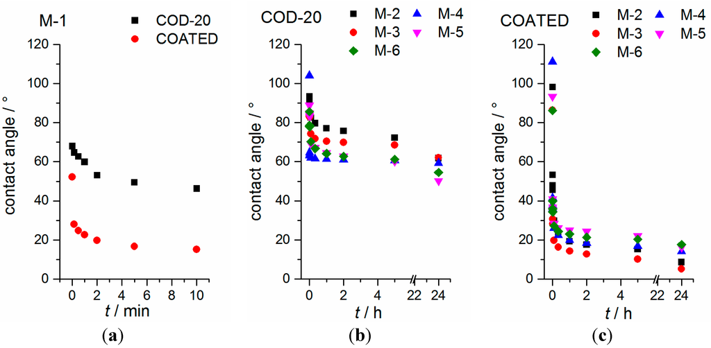 A representative behavior of the time-dependency of the contact angle is depicted in Figure 7 within t = 30 s. Principally, each droplet results in two contact angles, whereas at least 10 droplets are studied for all combination possibilities. It should be mentioned that the volume of the drop is large compared to the possible liquid uptake from the separator based on its thickness, thus a complete uptake into the interior of the separator is excluded. In Figure 8, the interaction of mixture M-1 with both separators is depicted within t = 10 min. The time period is chosen as a compromise between the evaporation of DMC and the relaxation time of forming a stable contact angle. A distinct difference can be observed between separator COD-20 (θ = 46.2° ± 1.1°) and COATED (θ = 15.2° ± 1.8°) in terms of the contact angle 10 min after dropping, which is significantly reduced by factor 3 when the PE polymer is coated by ceramic particles. A similar behavior is found for all other mixtures likewise (Figure 8). It demonstrates that polar ceramic particles combined with an increased surface roughness (taken from Figure 5) reduce the contact angle between separator and liquid phase significantly. Furthermore, it can be seen, that this effect is almost independent of surface tensions of the electrolytes (γL = 23.3–38.1 mN·m−1). It is observed that the reduction of contact angles between 5 and 24 h, where the separators are stored uncovered inside a glove box, is more pronounced in the case of separator COATED (factor 1.2–1.9) than of separator COD-20 (factor 1.0–1.2).