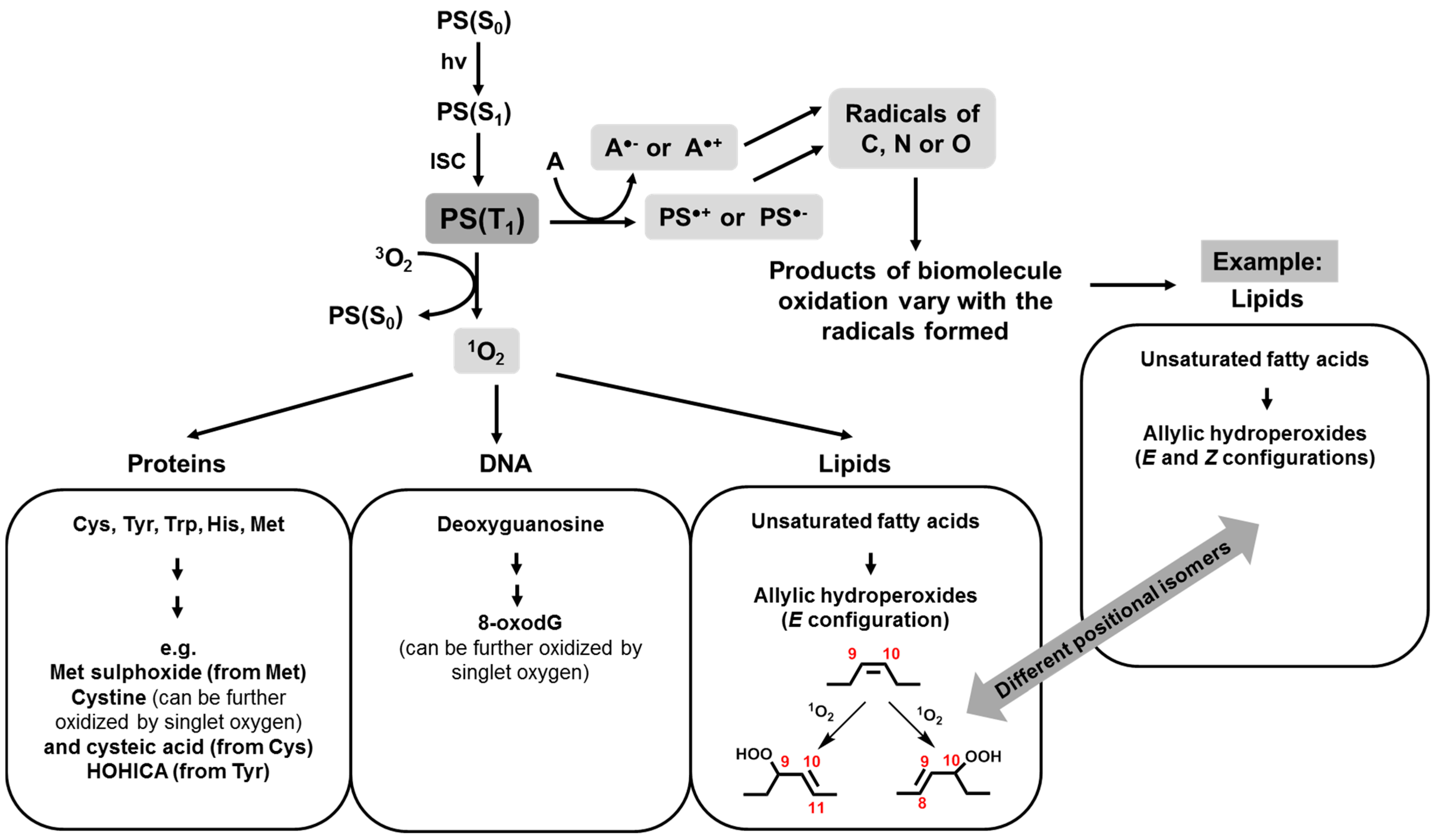 Most studies of photosensitized radical chain reactions are focused on proteins, lipids, carbohydrates, and DNA, though other biologically-relevant molecules can also be oxidized (including natural antioxidants, such as tocopherol). There are many reviews covering these processes extensively [33]. Take the case of lipids, for example: the radical chain reaction usually starts by abstraction of an allylic hydrogen by a radical, resulting in a carbon-centered radical. The ease of formation of this radical increases for polyunsaturated fatty acids containing bis-allylic hydrogens, and decreases for saturated lipids. Oxygen can react with this radical, generating a peroxyl radical. This can either abstract a hydrogen atom from another lipid, yielding a lipid hydroperoxide and a new lipid radical, or follow other reaction pathways that ultimately lead to the formation of oxidized lipids belonging to different organic functions (such as aldehydes, carboxylic acids, alcohols, ketones, and even more complex functions for lipids bearing higher numbers of double bonds). It is noteworthy that radical oxidation of lipids yield both E (trans) and Z (cis) hydroperoxides, as well as being able to generate different positional isomers if compared to singlet oxygen oxidation [14,16]. The important message is that products of oxidation by singlet oxygen or radicals may not be the same.
