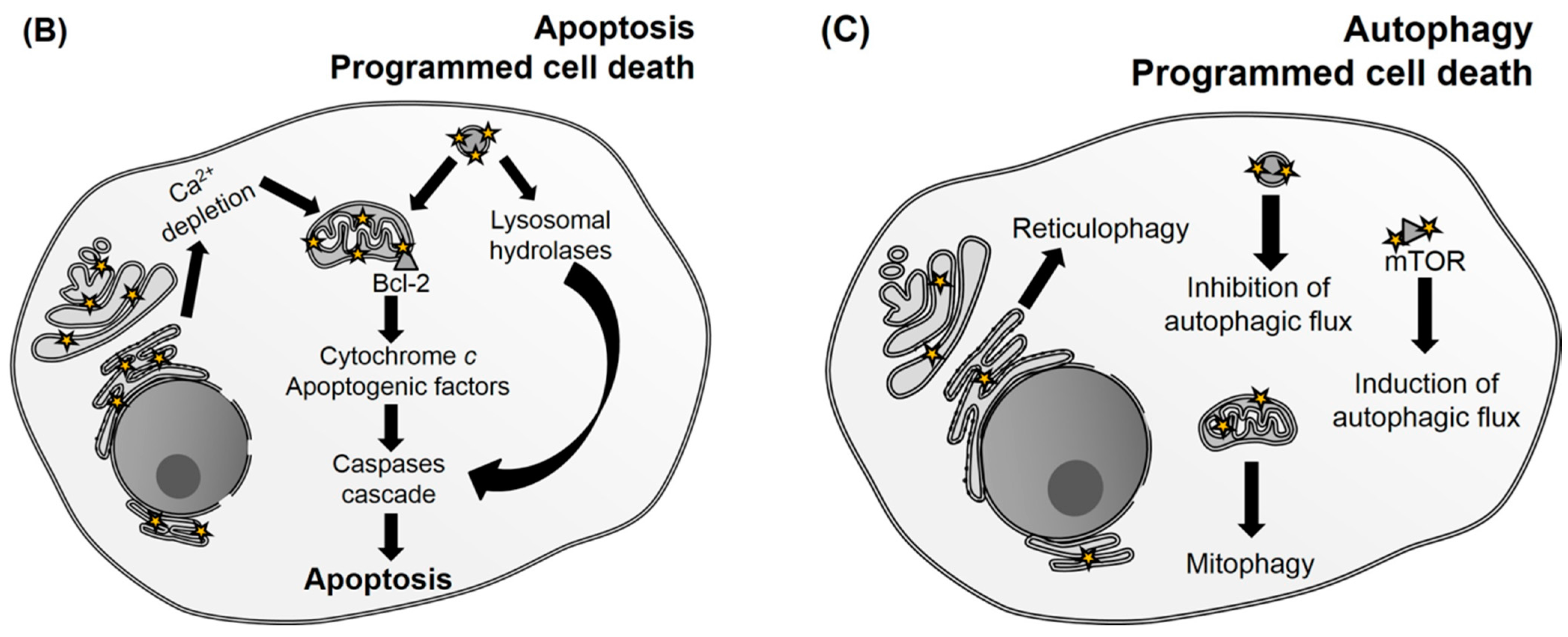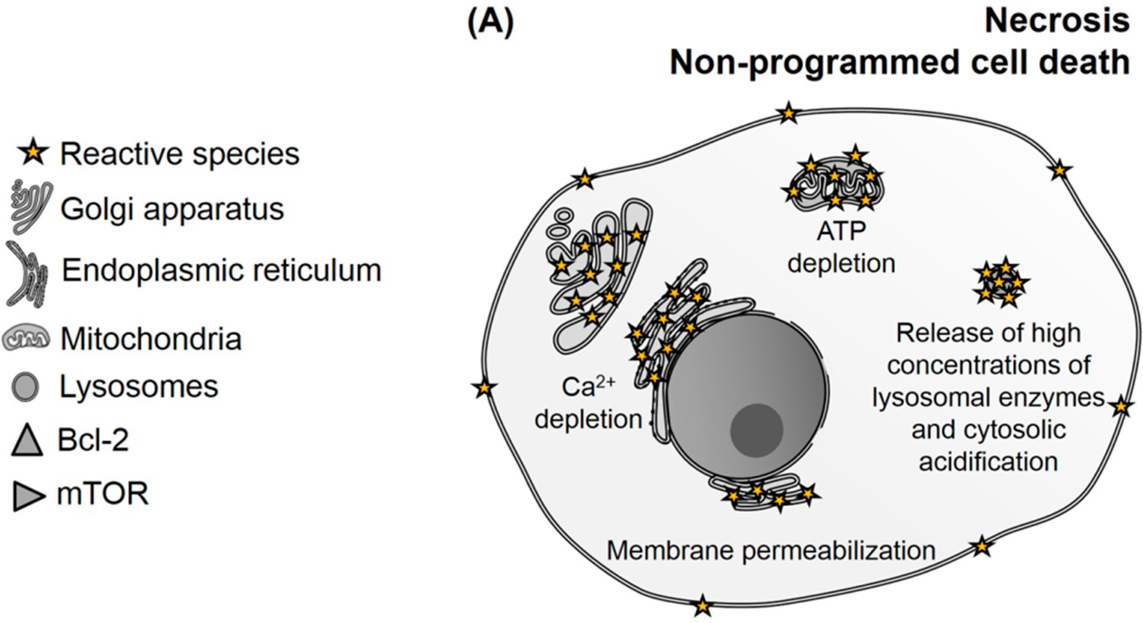 Targeting lysosomes also provides necrosis, apoptosis, and autophagic cell death mechanisms, depending on the PDT-dose. High doses of PDT induce complete breakdown of this organelle releasing high concentrations of lysosomal enzymes (such as cathepsins B, D, L) into the cytoplasm, resulting in unregulated necrosis [92,93]. On the other hand, partial damage to lysosomes causes the release of hydrolases, which are able to cleave pro-apoptotic proteins, triggering apoptotic cell death and/or inhibition of the autophagic flux. This latter phenomenon compromises cytoprotection mechanisms and leads to autophagic cell death [89].
