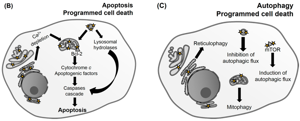 | Hypericin | ER | Loss of SERCA (sarco/endoplasmic reticulum Ca2+-ATPase) protein levels causing ER-Ca2+ depletion | Apoptosis and autophagy | [85,107,108] |