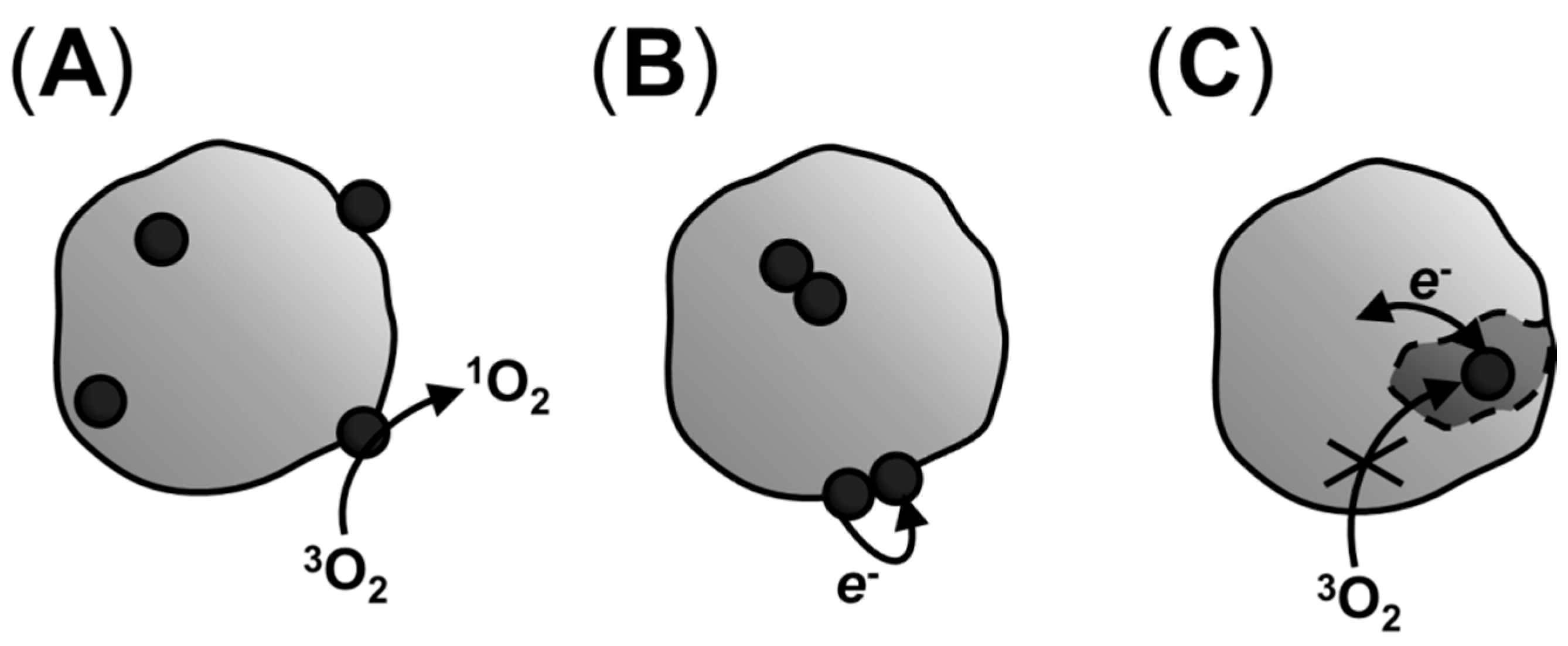 Triplet excited state deactivation pathways (i.e., electron or energy transfer) and, hence, the efficiency of singlet oxygen generation, will also be changed in the biological medium if compared with isotropic solutions. Many PSes can act both by electron or energy transfer, provided that the triplet excited state has enough energy to sensitize singlet oxygen formation and redox potentials compatible with existing substrates [34,40,140]. The relative occurrence of each process will depend on factors such as their rate constants, the concentration of oxygen or other substrates in the surrounding medium and also on interactions with other molecules or with PS molecules on their own [1,3,16,141,142,143,144]. All these factors will depend on the nanoenvironment where the PS is: lipid membranes, for example, are richer in oxygen than the surrounding solution, and PSes that localize deeper on the membrane encounter higher concentrations of oxygen [50]. Ding et al., for example, showed that 5,10,15,20-tetrakis(meso-hydroxyphenyl)porphyrin (mTHPP) encapsulated in polymeric micelles results in greater PDT photototoxicity against cancer cells under hypoxic conditions due to significant increase in generation of a superoxide radical in the electron-rich micelle core, competing with singlet oxygen generation. Indeed, electron transfer becomes dominant under hypoxic conditions [129]. The pathway followed by the triplet excited state may also change during the course of irradiation, due to PS chemical and photochemical transformation, as well as availability of novel substrates (photooxidized molecules), the presence of highly prevalent reducing species and/or depletion of initial reactants (such as oxygen or radical reaction substrates).