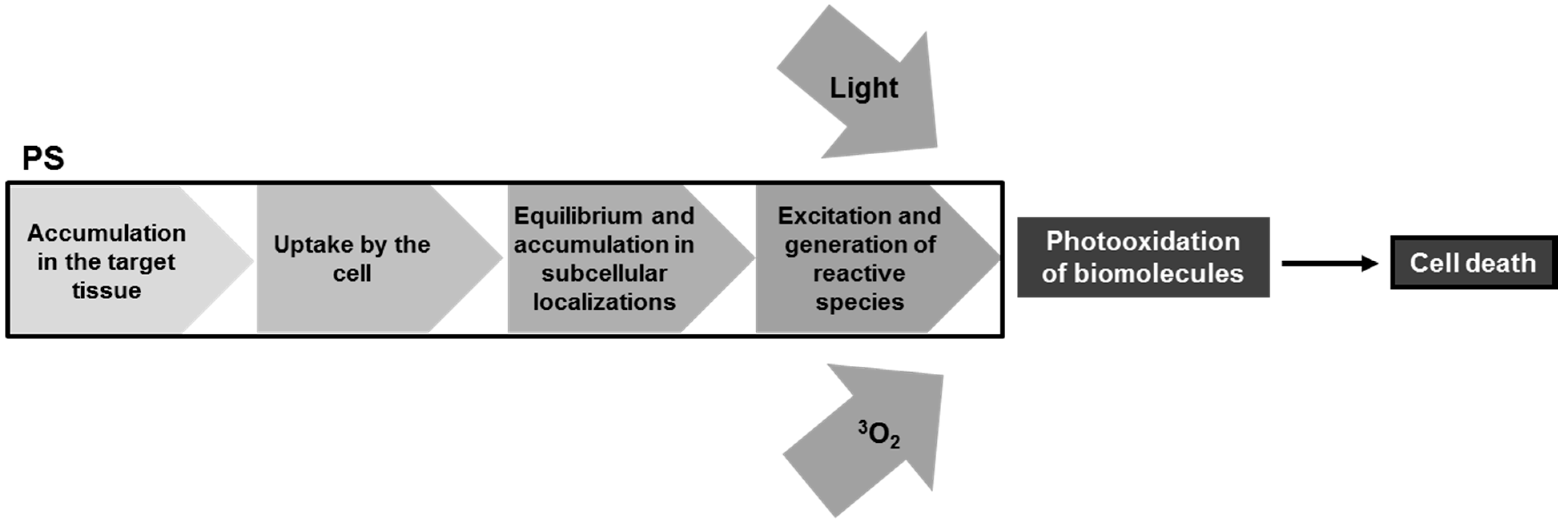 When cells are treated with PS, a number of steps must take place before cell death is achieved. Namely, the PS must be internalized by the cell, equilibrate and accumulate in subcellular localizations, be excited and only then oxidize biomolecules. At the same time, light must reach the absorbing molecules, as well as oxygen should be available or properly delivered (Figure 4).