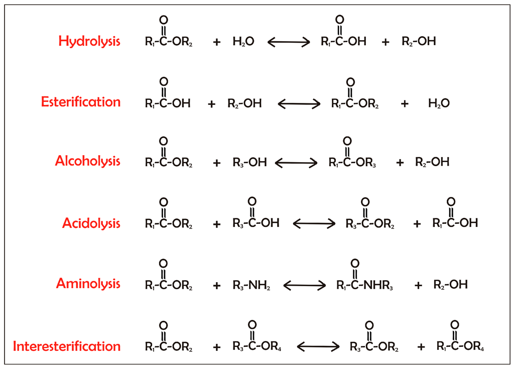 Under natural conditions, such as in the presence of excess water, lipases act at the organic–aqueous interface to catalyze the hydrolysis of carboxylate ester bonds and the release free fatty acids (FFAs) and organic alcohols (Figure 1). As the equilibrium between the forward and reverse reactions is controlled by the water activity (aw) of the reaction mixture, under limiting water conditions the reverse reaction, the esterification, can occur (Figure 1). Under low aw, different transesterification reactions can also be achieved. The term transesterification refers to the exchange of groups between an ester and an alcohol (alcoholysis), between an ester and an acid (acidolysis), between an ester and an amine (aminolysis), or between two esters (interesterification) [14] (Figure 1).