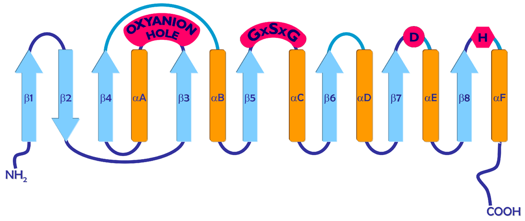 Despite differences in size and low primary sequence identity, the lipases show very similar structural folding patterns. This structure is an α/β hydrolase fold, and it is common also to many other hydrolases, such as esterases, proteases, dehalogenases, epoxide hydrolases, and peroxidases [32]. As shown in Figure 3, the canonical α/β hydrolase fold is characterized by the presence of a central β-pleated sheet that contains eight parallel β-strands, with the exception of β2 strand, which is antiparallel with respect to the others. The β3 to β8 strands are connected by α helices, which pack on the two sides of the central β sheet [33].