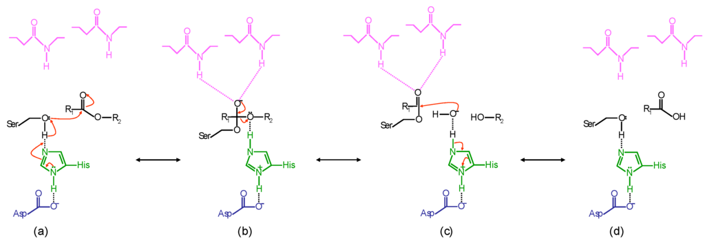Mechanism of the hydrolysis reaction of ester bonds catalyzed by lipases. Aspartate and histidine are shown in blu and green, respectively; serine, substrate and water are shown in black; the oxyanion hole residues are shown in magenta. (a) Nucleophilic attack of the serine hydroxyl on the carbonyl carbon of the susceptible ester bond; (b) tetrahedral intermediate; (c) acyl-enzyme intermediate, released alcohol and nucleophilic attack by water; (d) free enzyme and released acyl product.