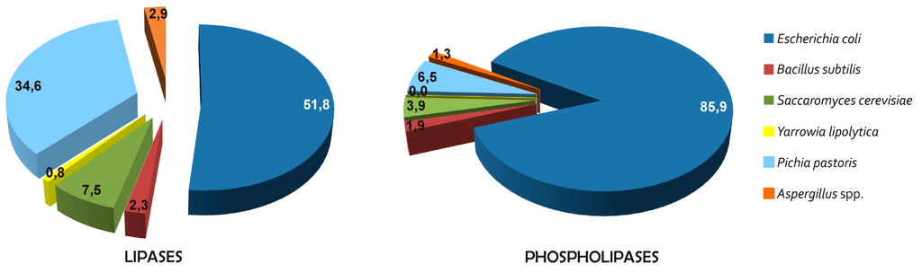 The majority (more than 75%) of enzymes currently used in industrial processes are hydrolytic in action [6]. Among these, the lipases and phospholipases are the enzymes that are used for lipid modifications. Lipases represent the third most commercialized enzymes, after proteases and carbohydrases [7], and their production has constantly increased, such that they now account for more than one-fifth of the global enzyme market. Lipases form an integral part of the industries ranging from biodiesels, food, nutraceuticals and detergents with minor applications also in bioremediation, agriculture, cosmetics, leather and paper industries [8]. For the phospholipases, several genes have been cloned, expressed and patented in the literature, although their major applications have only been in a few industries, such as food, nutraceuticals and oil degumming [9].