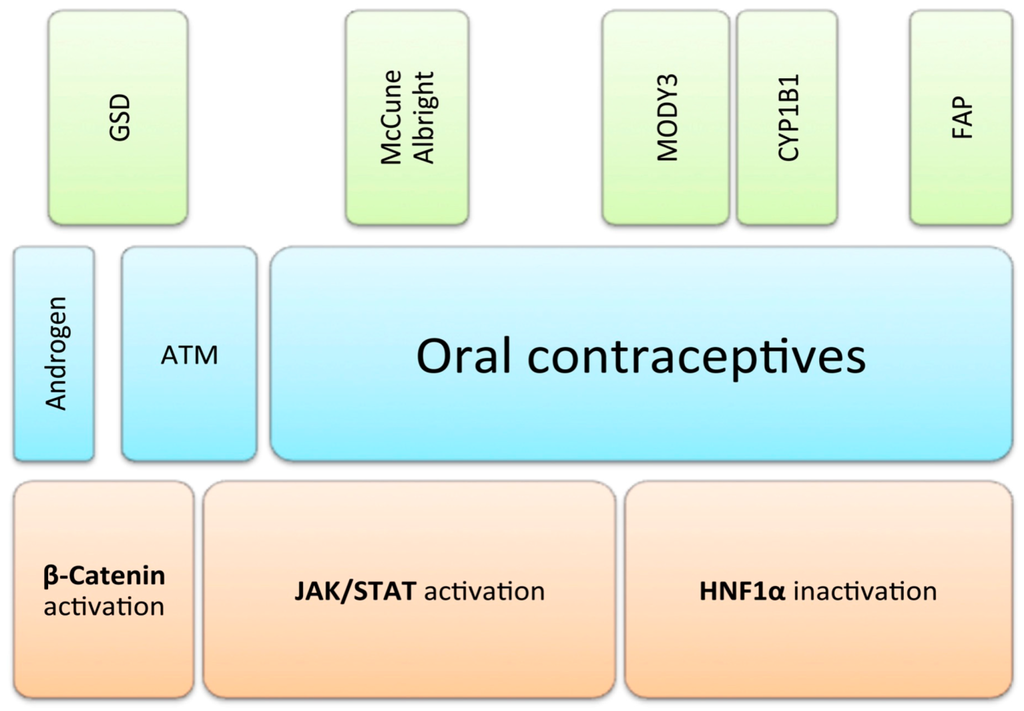 Risk factors of hepatocellular adenomas (HCA). Various genetically-defined predisposing factors are depicted in green. Blue bars represent environmental factors frequently associated with the development of HCA, second to none the use of oral contraceptives in females. Orange boxes in the lowermost line represent three distinguishable molecular pathways, which define the main subgroups of HCA. GSD: glycogenosis; FAP: familiar adenomatous polyposis; ATM: alcohol, tobacco, metabolic syndrome; JAK: Janus kinase; STAT: signal transducer and activator of transcription; HNF1α: hepatocytic nuclear factor 1 α.