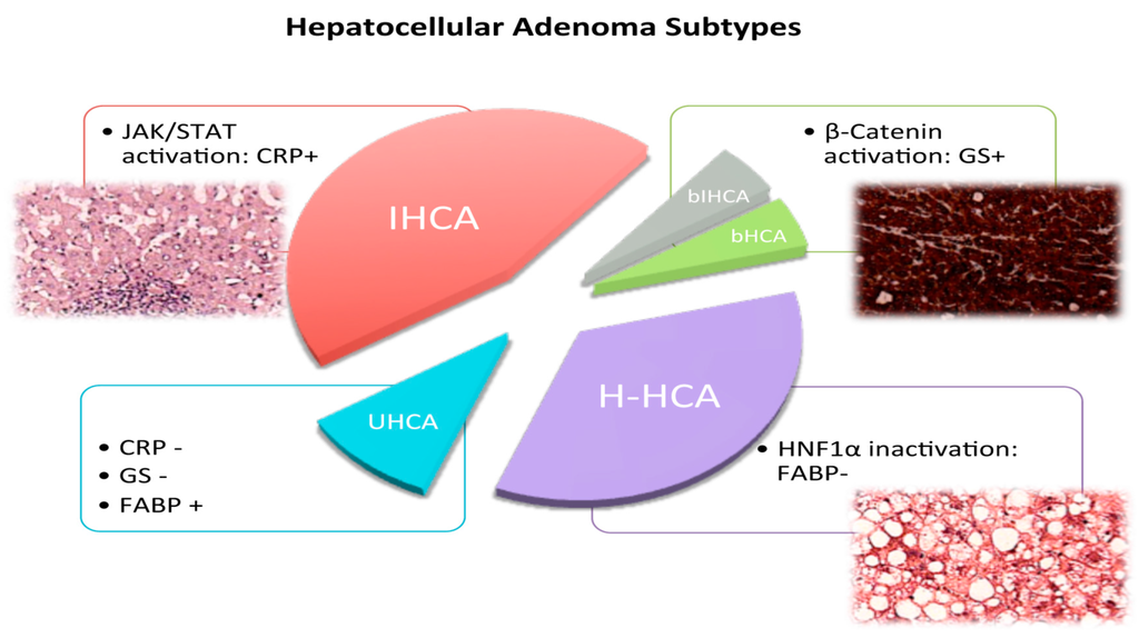 During the past decade, Zucman-Rossi’s group has been achieving tremendous progress in characterizing HCA on a molecular basis. They defined four subcategories of HCA substituting three groups with genetically-defined tumorigenesis. Mutations inactivating hepatocytic nuclear factor 1 α (HNF1α) are responsible for 35% of HCA (H-HCA) [10,11,12], mutations activating β-catenin result in β-catenin activated HCA (bHCA) in 10% of affected patients [9], mutations activating the JAK/STAT3 pathway lead to inflammatory HCA (IHCA), accounting for 45% of HCA [5,13]. The remaining, yet unclassified tumors, lack the latter characteristics [5] (Figure 2). In 2010, the French classification found its way into the WHO Classification of Liver Tumors; since then, pathologists have been applying it on small biopsies and resection specimens.