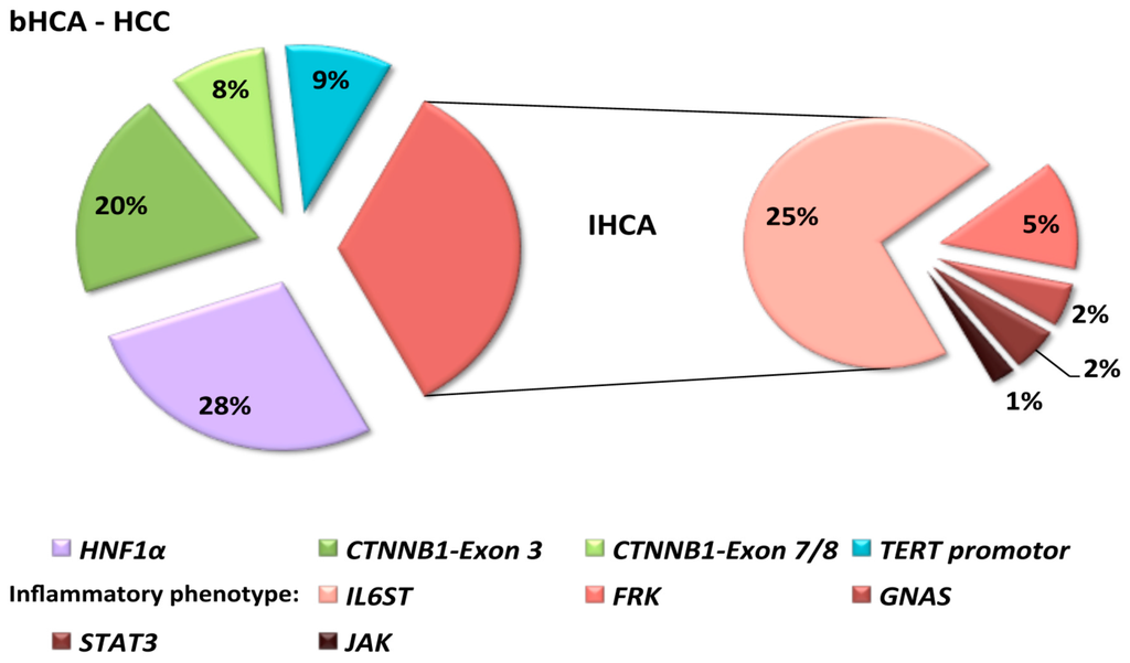 Half bHCAs combine genetic events activating Wnt/β-catenin signaling plus inflammatory phenotypes and, therefore, are classified dually and shortened bIHCA (see below) [14]. On the contrary, β-catenin activating mutations are absent in H-HCAs [9].