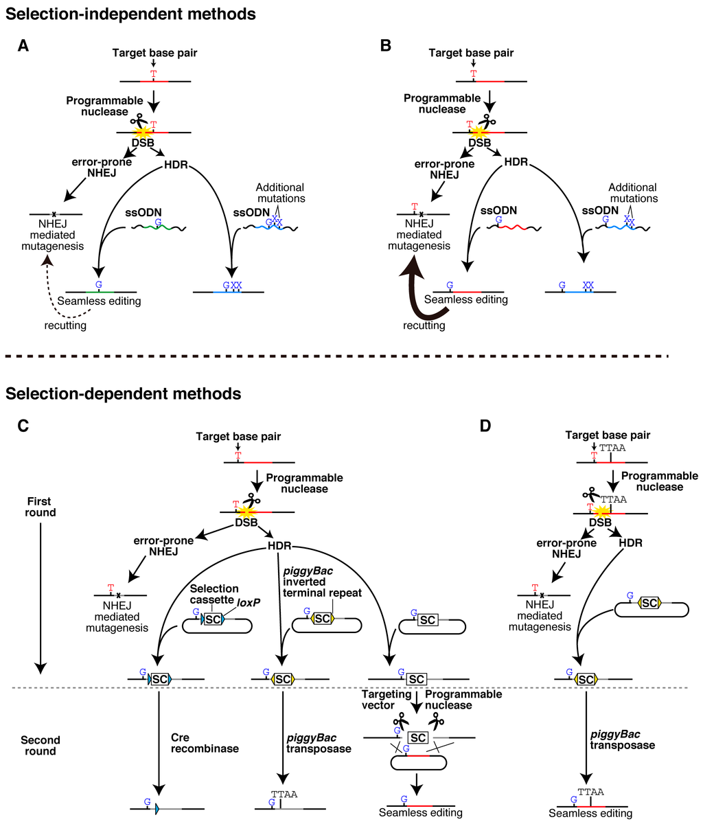 Seamless single-base pair editing and related techniques require highly site-specific programmable nucleases, and exploit homology-directed repair (HDR), one of two major endogenous DSB repair pathways (Figure 1). These techniques are categorized into two classes based on whether selection markers are used.