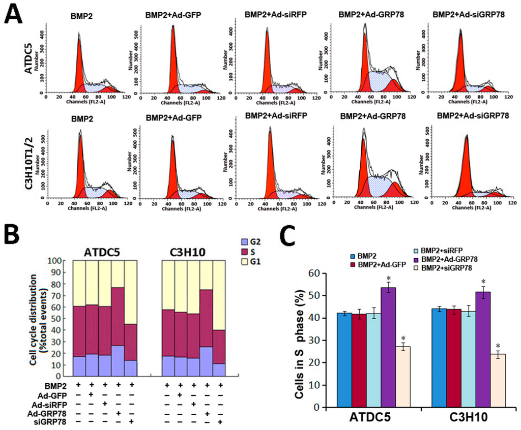 Cellular proliferation analysis by FCM. (A) Flow cytometry images with propidium iodide staining and analysis on cell cycle distribution. Micromass culture of ATDC5 cells and C3H10T1/2 were treated with BMP2 (300 ng/mL)/BMP2 + Ad-GFP/BMP2 + Ad-siRFP / BMP2 + Ad-GRP78 / BMP2 + Ad-siGRP78. Flow cytometry analysis showed that the percentage of the BMP2 + Ad-GRP78 ATDC5 cells in S phase were increased significantly compared to those in BMP2 controls, whereas the percentage of the BMP2 + Ad-siGRP78 ATDC5 cells in S phase were dramatically decreased compared with BMP2 control. The result of C3H10T1/2 is the same. Experiments were repeated three times, and samples were analyzed by Student’s t-test and statistical significance with p < 0.05. Representative images were shown; (B) Flow cytometry assay on the percentages of the ATDC5 and C3H10T1/2 cells in G2/M phase after treatment with BMP2 (300 ng/mL)/BMP2 + Ad-GFP / BMP2 + Ad-siRFP / BMP2 + Ad-GRP78 / BMP2 + Ad-siGRP78; (C) Flow cytometry analysis showed that the percentages of the ATDC5 and C3H10T1/2 Ad-GRP78 cells in S phase were increased significantly, whereas the percentages of the ATDC5 and C3H10T1/2 Ad-siGRP78 cells in S phase were decreased compared with those in their controls. * p < 0.05 compared with control.