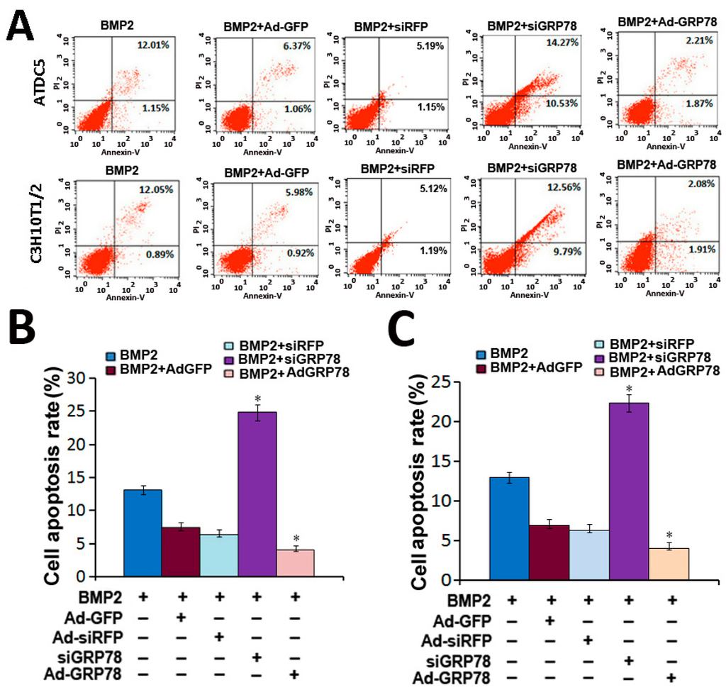 In the flow cytometry assay shown in Figure 5A, the cell apoptosis rate was clearly increased after being infected with BMP2 + Ad-siGRP78 compared with BMP2 + siRFP control and BMP2 group in micromass culture of ATDC5 cells for three days. The cell apoptotic rate was 13.16%, 6.34% and 24.8% in BMP2 group, BMP2 + siRFP group and BMP2 + Ad-siGRP78 group, respectively. While the cell apoptotic rate was reduced after being infected with Ad-GRP78 compared with BMP2 + Ad-GFP control and BMP2 group. The cell apoptotic rate was 4.08% in BMP2 + Ad-GRP78 ATDC5 cells. In addition, in micromass culture of C3H10T1/2 cells, the cell apoptosis rate was also increased after being infected with BMP2 + Ad-siGRP78 group (22.35%) compared with BMP2 + siRFP control (6.31%) and BMP2 group (12.94%) in micromass culture of C3H10T1/2 cells for three days. While the cell apoptotic rate was reduced after being infected with BMP2 + Ad-GRP78 group (3.99%) compared with BMP2 group. The differences between treatment groups and BMP2 groups have statistical significance (* p < 0.05, Figure 5B,C). Taken together, these data demonstrate that overexpression of GRP78 can inhibit, while knockdown of GRP78 via the RNAi approach can enhance ER stress-mediated apoptosis in chondrocyte differentiation induced by BMP2.