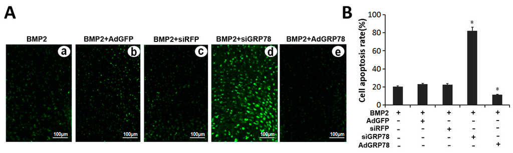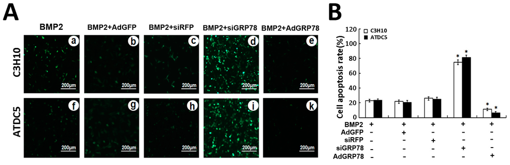 Incidentally, in the C3H10T1/2 BMP2 + Ad-siGRP78 cells, the number of TUNEL-positive cells obviously increased (76.13%) compared with C3H10T1/2 BMP2 cells (23.02%), while the number of TUNEL-positive cells reduced in the C3H10T1/2 BMP2 + Ad-GRP78 cells (8.29%). The differences between BMP2 + Ad-GRP78, BMP2 + Ad-siGRP78, BMP2 + Ad-GFP, BMP2 + Ad-siRFP, BMP2 groups have statistical significance (* p < 0.05 Figure 7B). Note that GRP78 can inhibit ER stress-mediated apoptosis in chondrocyte differentiation induced by BMP2.