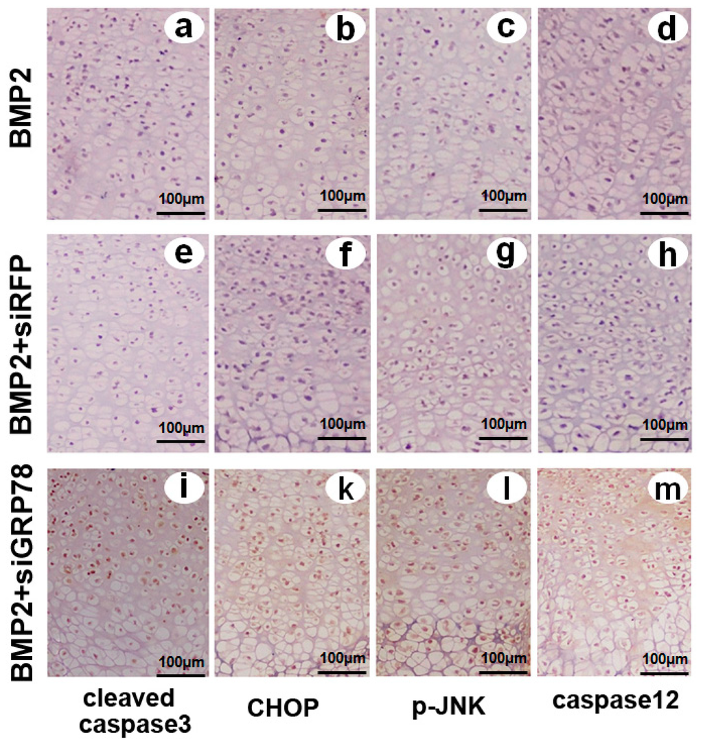 Expression of cleaved caspase3, CHOP, caspase12 and p-JNK in the growth plate chondrocytes in vivo. Metatarsals were explanted from 17-day-old mouse embryos and cultured in the presence of conditioned medium of BMP2 (300 ng/mL), BMP2 + siRFP, BMP2 + siGRP78 for 5 days. (a), (e) and (i) Immunohistochemistry staining was observed in low-power microphotograph of a section stained with anti-active caspase3 monoclonal antibody (brown) and counterstained with Mayer’s hematoxylin (blue); (b), (f) and (k) Immunohistochemistry staining was observed in a low-power microphotograph of a section stained with anti-CHOP monoclonal antibody (brown) and counterstained with Mayer’s hematoxylin (blue); (c), (g) and (l) Immunohistochemistry staining was observed in low-power microphotograph of a section stained with anti-p-JNK monoclonal antibody (brown) and counterstained with Mayer’s hematoxylin (blue); (d), (h) and (m) Immunohistochemistry staining was observed in low-power microphotograph of a section stained with anti-caspase12 monoclonal antibody (brown) and counterstained with Mayer’s hematoxylin (blue) and the scale bars represent 100 μm.