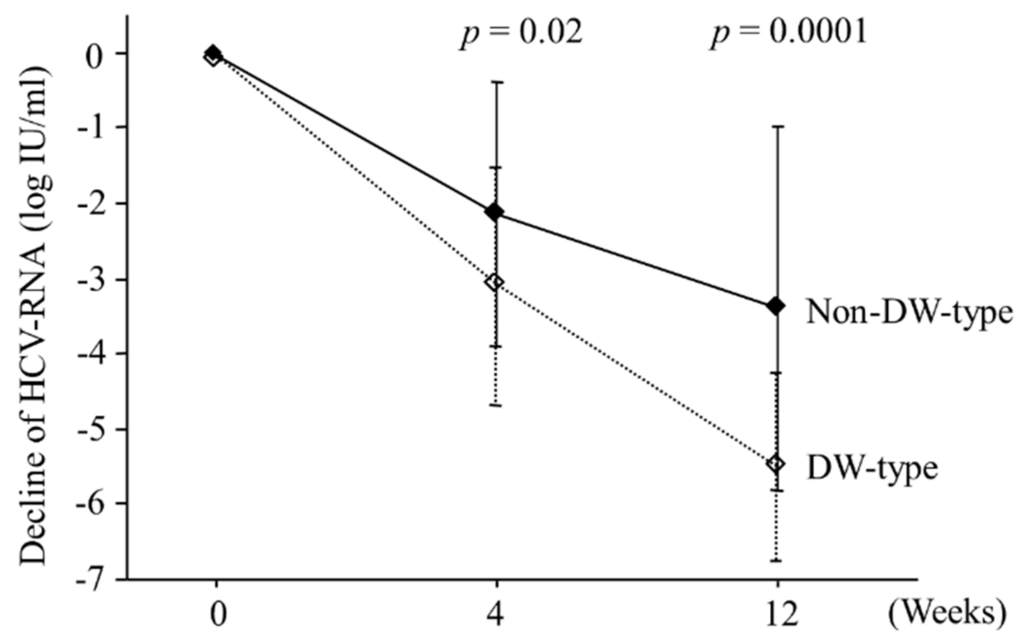 Figure 2 shows a decline in HCV RNA levels from baseline to weeks 4 and 12 during the combination therapy according to amino acid patterns at positions 70 and 91 in the core region. The fall in HCV RNA level at week 4 was significantly higher in patients with DW-type than in those with non-DW-type amino acid (−3.1 ± 1.6 vs. −2.1 ± 1.8 log IU/mL; p = 0.02): differences at week 12 were more clear (−5.5 ± 1.3 vs. −3.4 ± 2.4 log IU/mL; p = 0.0001).