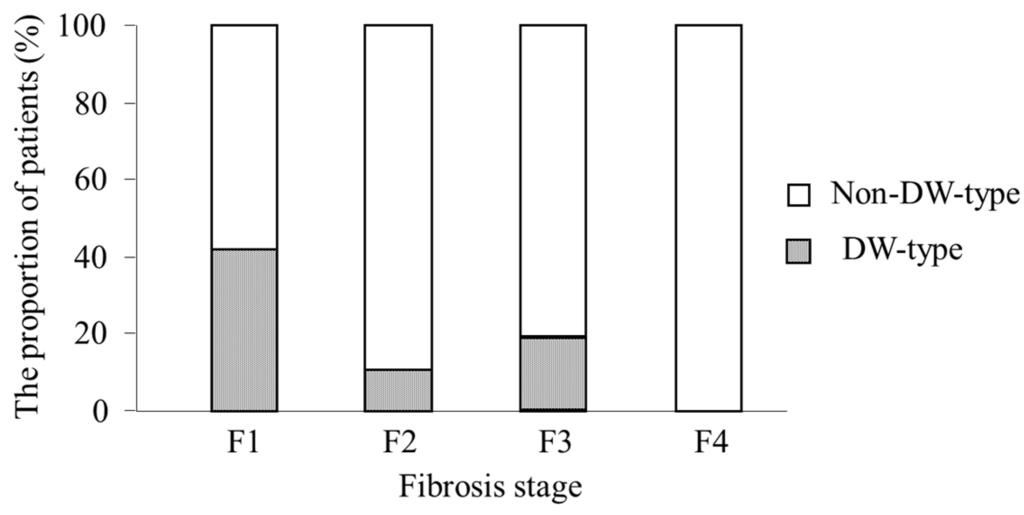 We analyzed the relationship between the presence of the DW-type amino acid and patient profiles and found that fibrosis stage (p = 0.02) was the only factor that correlated with the presence of DW-type amino acid: patients showed a decreasing trend for the proportion of DW-type amino acid according to fibrosis stage (16/38 (42%) for F1, 3/27 (11%) for F2, 5/25 (20%) for F3, and 0/3 (0%) for F4; p = 0.01; Figure 3). The proportion of DW-type amino acid in patients with mild fibrosis (F1) was significantly higher than those with advanced fibrosis (≥F2) (16/38 (42%) vs. 8/55 (15%), p = 0.003).