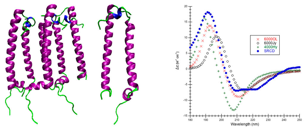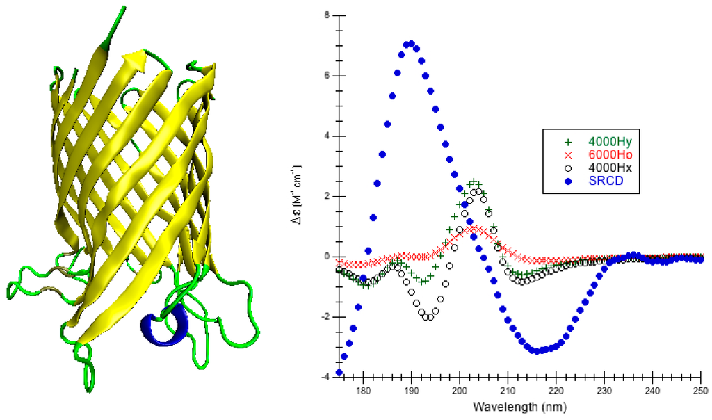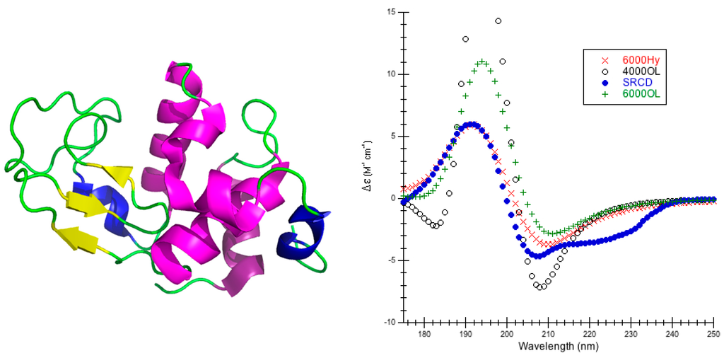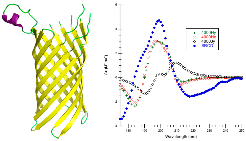 44]. Although it is not necessary to have SRCD for secondary structure analysis or comparing theoretical calculations of the π-π* of the amide chromophore, the great advantage of the PCDDB is that the spectra contained within are well refereed and standardized so that the research community can depend on the high quality of experimental CD just as the community can depend on the high quality of crystal structures found in the Protein Data Bank (PDB). Even the raw sample spectra, raw baseline spectra, average sample and averaged baseline, the net smoothed spectrum and the final processed spectrum are all made available in both digital and graphical formats. Furthermore, SRCD is sensitive to different kinds of protein folds [