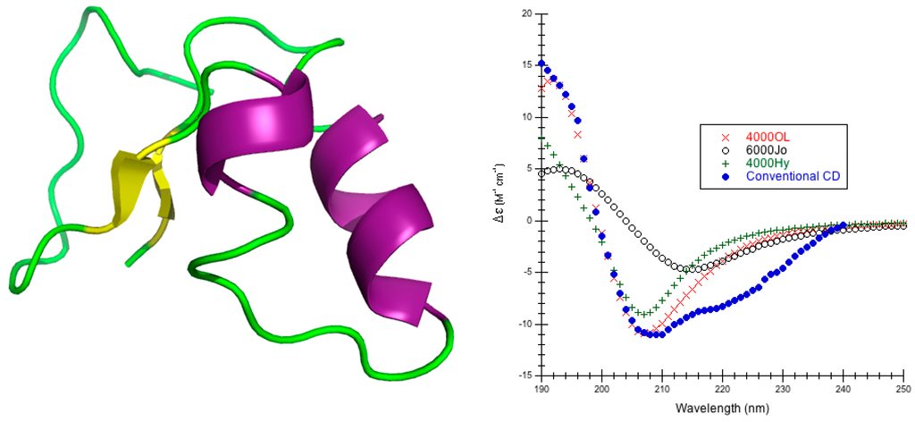 1]. CD spectroscopy offers some salient advantages, such as simplicity, nondestructive procedure, rapid performance and small amounts of materials in the determination of molecular shape; it functions well even for large multimeric proteins that can neither be crystallized nor measured with NMR [