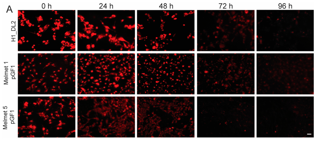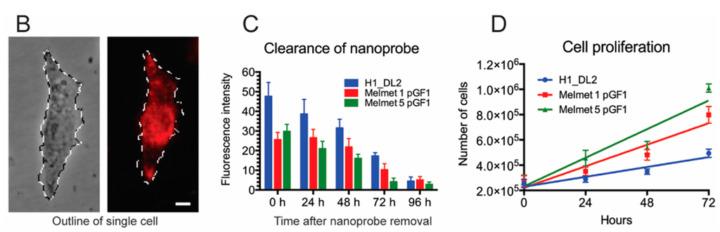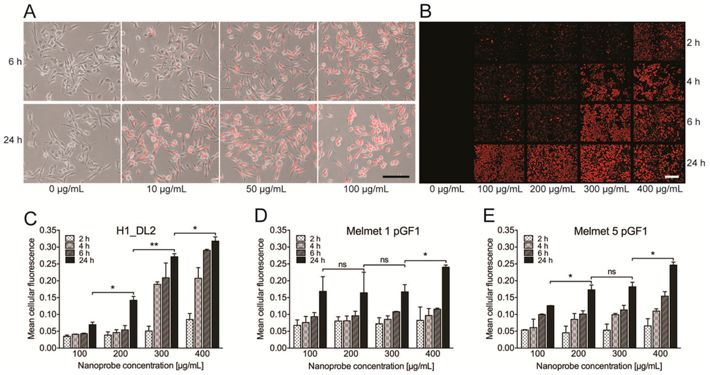 The Melmet 1 pGF1, Melmet 5 pGF1 and H1_DL2 cells were seeded into six-well plates at a density of 1 × 105 cells/mL in 2 mL complete DMEM, and incubated for 24 h. The growth medium was then replaced with complete DMEM containing nanoprobe at a concentration of 200 μg/mL. After a further incubation period of 24 h, the labeling solution was exchanged with complete DMEM without nanoprobe. Four micrographs of the labeled cells were captured every 24 h for four days using a Nikon TE2000 inverted microscope (Nikon Instruments Inc., NY, USA) with a 20× objective. In each micrograph, 16 single cells were processed to find the average cellular fluorescence intensity using Photoshop CS5 (Adobe Systems Inc., San Jose, CA, USA).