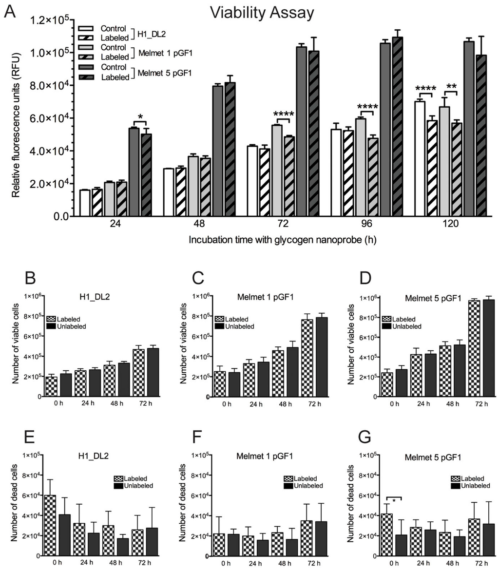Cell viability in monolayer cultures. (A) Monolayer resazurin assay to determine viability of labeled and unlabeled melanoma metastatic cell lines for 120 h. The labeled cells were exposed to 200 μg/mL of the glycogen nanoprobe during the whole time period (for all experiments, n = 8; mean ± SD). The relative fluorescence units (vertical axis) were proportional to the number of viable cells. * p < 0.05, ** p < 0.01, **** p < 0.0001; (B–D) Cell counting assay to determine the number of viable cells in monolayer cultures of labeled and unlabeled cell lines during 72 h. The labeled cells were exposed to 200 μg/mL of the glycogen nanoprobe during the whole time period (for all experiments, n = 6; mean ± SD): (B) H1_DL2 cells; (C) Melmet 1 pGF1 cells; and (D) Melmet 5 pGF1 cells; (E–G) Cell counting assay to determine the number of dead cells in monolayer cultures of labeled and unlabeled cell lines during 72 h. The labeled cells were exposed to 200 μg/mL of the glycogen nanoprobe during the whole time period (for all experiments, n = 6; mean ± SD): (E) H1_DL2 cells; (F) Melmet 1 pGF1 cells; and (G) Melmet 5 pGF1 cells.