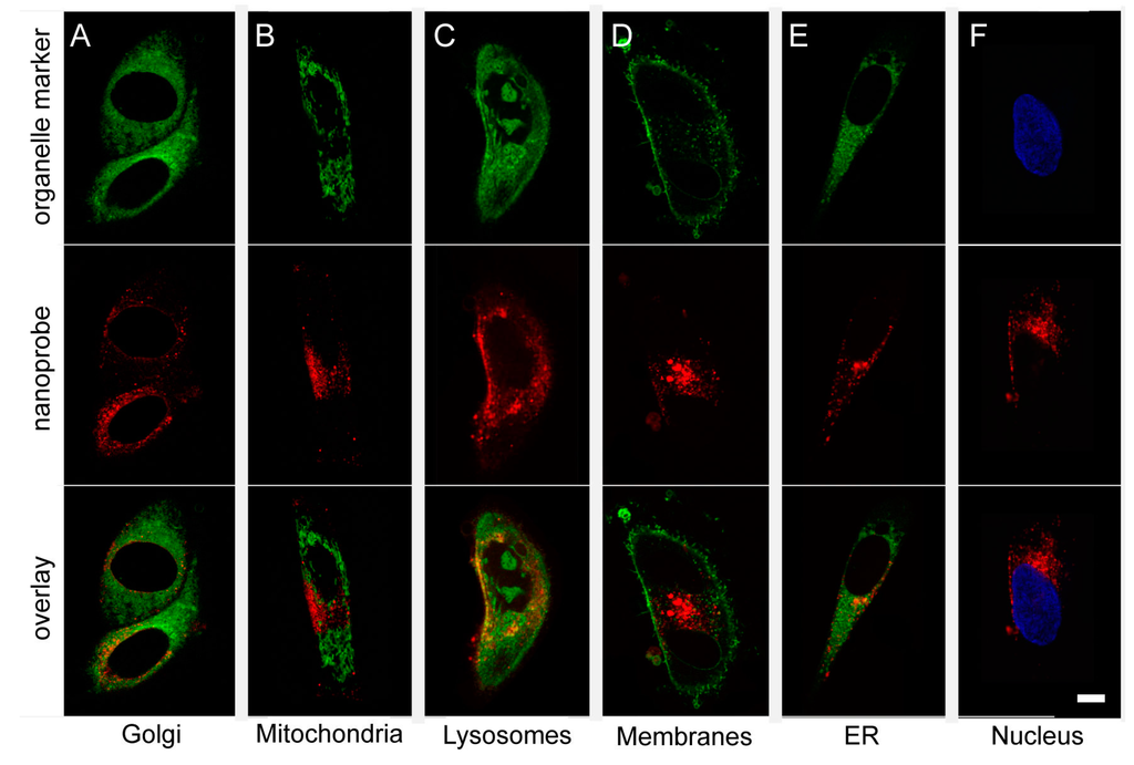 To investigate the subcellular localization of the nanoprobe, H1 human metastatic melanoma cells were labeled with the nanoprobe and incubated with markers for different cellular organelles (Figure 3, Table 1). In general, the nanoprobe was localized within the cytoplasm of the cells. Our analysis showed that the only organelle able to internalize the nanoprobe were the lysosomes (Figure 3C, R = 0.5614). All other organelles investigated had a random co-distribution with the nanoprobe, and no co-localization could be detected (R < 0.5, Table 1).